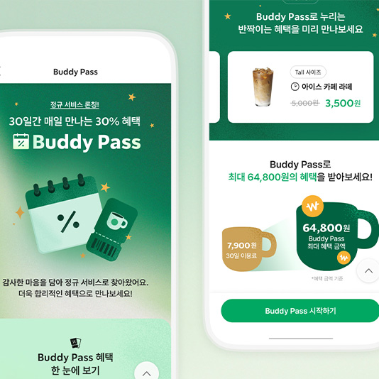 “월 7,900원으로 즐기는 슬기로운 스벅생활” 스타벅스, 구독 서비스 ‘Buddy Pass’ 정규 프로그램 론칭스타벅스 코리아(대표이사 손정현)가 개점 25주년을 기념해 지난 10월 새롭게 선보인 구독 서비스 ‘Buddy Pass(이하 버디 패스)’를 12월 2일부터 정규 프로그램으로 정식 론칭한다.