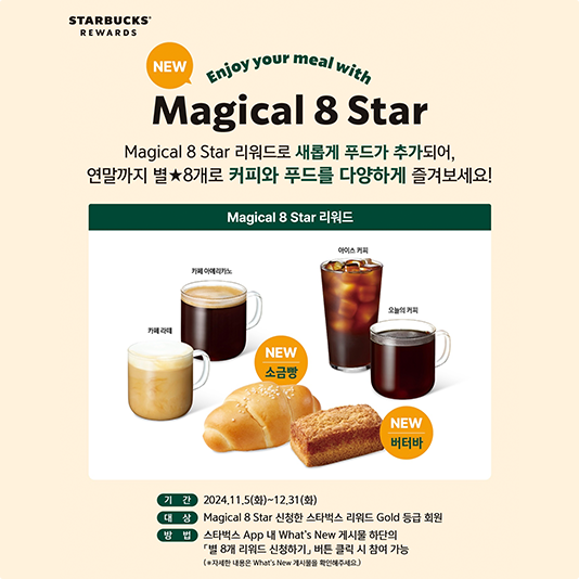 이제 푸드도 별 8개 쿠폰으로 즐긴다! 스타벅스, ‘Magical 8 star’ 리워드 혜택 강화스타벅스 코리아(대표이사 손정현)가 11월 5일부터 신규 리워드 프로그램인 ‘Magical 8 star’의 리워드 혜택에 푸드 2종을 새롭게 추가하며, 골드 회원 고객들의 선택권을 한층 넓힌다.