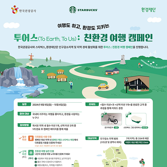 스타벅스, 한국관광공사와 지역 경제 활성화 위한 ‘투어스: 친환경 여행 캠페인’ 전개스타벅스 코리아(대표이사 손정현)는 한국관광공사, 환경재단과 함께 오는 10월 6일까지 인구감소 지역 및 지역 경제 활성화를 위한 ‘투어스(To Earth, To Us): 친환경 여행 캠페인’을 전개한다고 밝혔다.