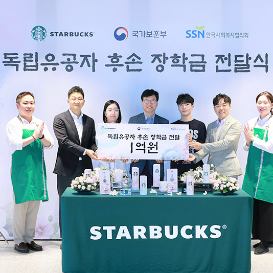 스타벅스, 광복절 기념해 독립유공자 후손 장학금 1억 원 전달스타벅스 코리아(대표이사 손정현)가 7일 스타벅스 지원센터에서 다가오는 광복절을 기념해 국가보훈부(장관 강정애), 한국사회복지협의회(회장 김성이)와 함께 ‘독립유공자 후손 장학금 전달식’을 진행했다.