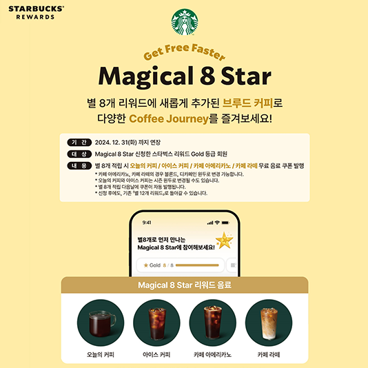 더 강력해진 혜택! 스타벅스, ‘Magical 8 star’ 운영 기간 연장스타벅스 코리아(대표이사 손정현)가 지난 5월 시범 도입한 신규 리워드 프로그램인 ‘Magical 8 star’의 운영 기간을 올해 말까지 연장한다고 23일 밝혔다.