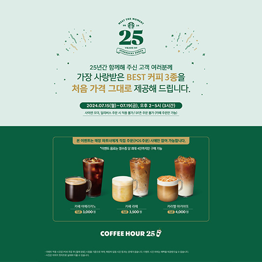 스타벅스 코리아, 개점 25주년 기념 고객 사은 행사 ‘커피 아워 25’ 시작!스타벅스 코리아(대표이사 손정현)가 오는 15일부터 5일간 베스트 음료 3종을 스타벅스 코리아의 최초 출시 가격에 제공하는 ‘커피 아워 25(COFFEE HOUR 25)’ 이벤트를 전개한다.