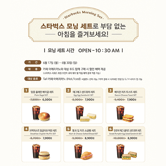 스타벅스, 고객 혜택 강화한 ‘모닝 세트’ 소개스타벅스가 고물가 시대 아침 식사를 챙기는 고객들의 부담을 덜어줄 식사 대용 세트 구성을 선보인다.