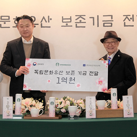 스타벅스, 독립문화유산 보존 기금 1억 원 전달스타벅스 코리아(대표이사 손정현)가 올해로 105주년을 맞이하는 삼일절을 기념해 독립문화유산 보존을 위한 기금 1억 원을 문화유산국민신탁(이사장 김종규)에 전달했다.