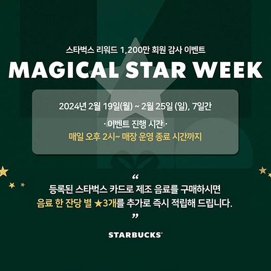 스타벅스, 리워드 회원 1,200만 명 기념 별 3개 추가 적립스타벅스 코리아(대표이사 손정현)가 고객 로열티 프로그램인 ‘스타벅스 리워드’의 누적 회원 수 1,200만 명 달성을 기념하는 추가 별 적립 이벤트를 진행한다.