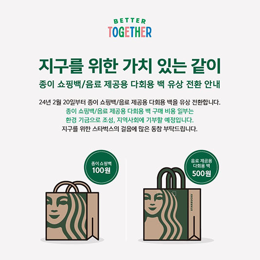 스타벅스, 2월 20일부터 종이 쇼핑백 및 다회용 백 유상화 시행스타벅스 코리아(대표이사 손정현)가 친환경 정책 강화 및 개인 다회용 백 이용 활성화의 일환으로 오는 20일부터 ‘종이 쇼핑백’을 사이즈 관계없이 100원, ‘음료 제공용 다회용 백(이하 다회용 백)’은 500원에 유상 제공하는 새로운 쇼핑백 운영 정책을 시행한다.