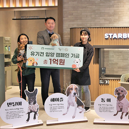 스타벅스, 유기 동물 인식 개선을 위한 ‘해피투개더’ 캠페인 기금 1억 원 기부스타벅스 코리아(대표이사 손정현)가 국내 첫 반려동물 동반 가능 매장인 구리갈매DT점의 오픈을 기념해 동물과 함께 행복한 세상(대표 최미금, 이하 동행)에 ‘스타벅스와 함께하는 해피투개더’ 캠페인 지원 기금 1억 원을 전달하고, 올해 유기 동물 입양 활성화 및 인식 개선을 위한 상생 활동을 더욱 강화해 나간다.