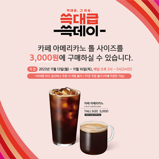 스타벅스, 쓱데이 맞아 해피아워 진행스타벅스 코리아(대표이사 손정현)가 신세계그룹 쇼핑축제 쓱데이를 맞아13일부터 16일까지 4일간 오후 2시부터 오후 5시 사이 카페 아메리카노 톨 사이즈를 3,000원에 제공하는 고객 사은 행사인 스타벅스 해피아워를 진행한다.