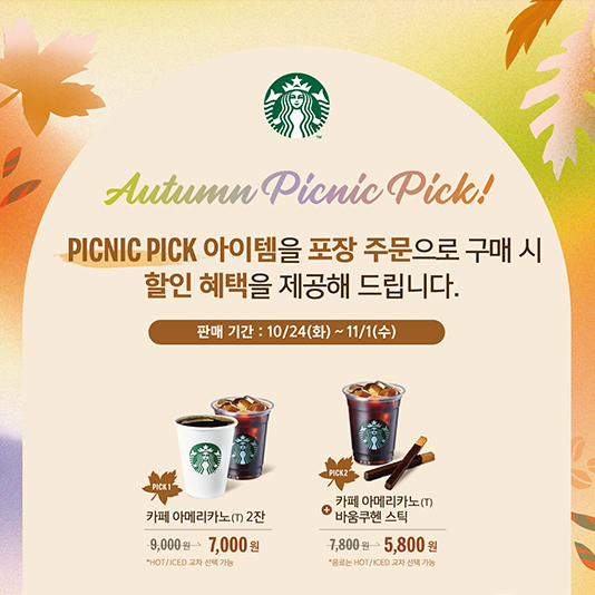 스타벅스가 제안하는 피크닉 아이템! 가을맞이 ‘피크닉 픽(PICK) 세트’ 할인 판매스타벅스 코리아(대표이사 손정현)가 10월 24일부터 11월 1일까지 선선해진 가을 피크닉에 어울리는 아이템들을 제안하는 ‘피크닉 픽 세트’를 판매한다.