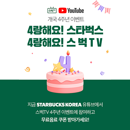 스타벅스, 유튜브 콘텐츠 ‘스벅TV’ 개국 4주년 이벤트 진행스타벅스 코리아(대표이사 손정현)의 공식 유튜브 채널 콘텐츠인 스벅TV가 개국 4주년을 기념하는 고객 감사 이벤트를 3월 14일부터 3월 23일까지 10일간 진행한다.