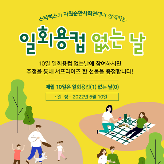 스타벅스, 1만명 고객 참여한 ‘다다익선 캠페인’, 스타벅스 개인컵 이용 건수도 53% 증가스타벅스 코리아(대표이사 송호섭)가 다회용 컵 사용 확산을 위해 환경재단(이사장 최열)과 함께 4월 5일부터 4월 30일까지 진행한 ‘다다익선 캠페인’에 1만명이 넘는 고객이 동참하며, 지난해 4월 대비 올해 4월 개인 다회용 컵 이용 건수가 53% 증가한 것으로 나타났다.