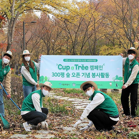 스타벅스, 고객과 파트너가 함께 만든 서울숲공원 ‘쉬었다가길’ 공개‘쉬었다가길’은 올해 4월부터 스타벅스의 개점 22주년을 기념해 참여고객 10명당 1평씩 면적을 늘려 최대 220평의 숲 조성을 목표로 전개된 환경 캠페인 ‘Cup a Tree(나무 품은 컵)’ 캠페인을 통해 조성되었다. 캠페인에 참여한 고객들은 지난 4월 다회용 컵을 활용해 식물을 심거나 다회용 컵과 주변 식물이 어우러진 모습을 SNS에 인증하고 친환경 메시지를 전달하는 등 비대면 방식으로 친환경 활동에 참여했다.
