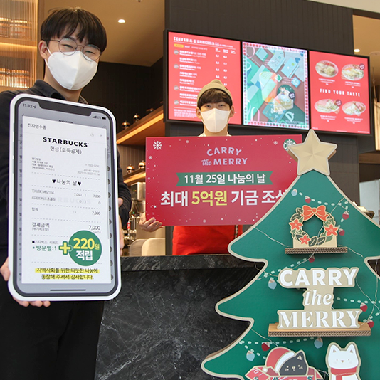 스타벅스, 11월 25일, 최대 5억원 기금 조성하는 ‘캐리 더 메리 나눔의 날’ 전개‘캐리 더 메리(CARRY the MERRY) 나눔의 날’은 작년에 이어 올해로 2회째 진행되는 연말 최대 규모의 기금 적립 행사로, 연말 스타벅스에서의 추억이 지역사회에 따뜻한 나눔으로 전달되길 바라는 마음을 담아 크리스마스 한달 전인 11월 25일 하루 동안 진행된다. 스타벅스 코리아 개점 22주년의 의미를 담아 11월 25일 당일 전국 스타벅스 매장에서 판매되는 모든 품목 1개당 220원씩, 스타벅스 리워드 회원에게 적립되는 별 1개당 220원씩을 매칭하여 단일 기부행사로는 연중 최대 규모인 5억원의 나눔의 날 기금을 조성한다.