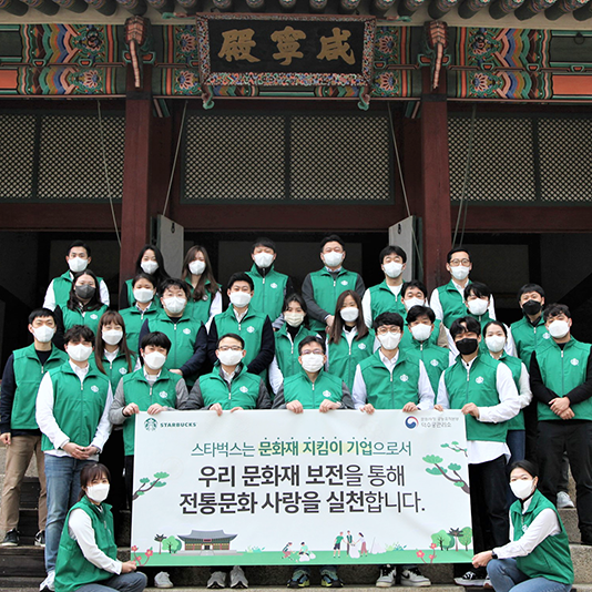 스타벅스, 덕수궁에서 봉사활동 진행하며 우리 문화재 보호에 앞장선다.㈜스타벅스커피 코리아(대표이사 송호섭)가 덕수궁에서 정화 활동을 진행하며 우리 문화재 보호 활동에 앞장서고 있다. 스타벅스 파트너 30명은 덕수궁 함녕전과 즉조당 등의 대청마루와 창틀, 기둥 등의 정화 작업을 진행했다. 해당 전각들은 화재를 대비해 방염 처리되어 바닥이 끈적해진 곳이 많았지만 이날 파트너들로 인해 깨끗하게 정비되었다. 스타벅스는 지난 2009년부터 문화재청과 ‘문화재 지킴이’ 협약을 맺고 고궁 문화 행사를 비롯해, 고궁 청소와 식재 활동, 전통 문화 디자인을 담은 매장 소개 및 MD 개발 등 다양한 문화재 보호 활동을 실천해 오고 있다.