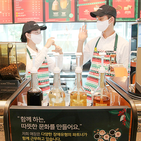 스타벅스, 차별 없는 채용 앞장서며 3회 연속 장애인고용 우수사업주로 선정지난 2007년부터 장애인 채용을 시작한 스타벅스는 2012년 업계 최초로 한국장애인고용공단과 고용증진 협약을 체결하고 장애유형, 장애정도의 구분 없이 분기별로 장애인 채용 모집을 진행하고 있다. 10월 현재 총 395명의 장애인 파트너들이 전국 스타벅스 매장에서 근무하고 있으며, 이 중 중증은 323명, 경증은 72명이다. 중증 장애를 2배수로 하는 법적 장애인 근로자 수는 718명이며 전체 임직원 대비 장애인 파트너 고용률은 3.6%로 높은 수준이다. 또한 장애인 파트너에게도 차별 없이 동등한 승진 기회를 부여해 48명의 장애인 파트너가 중간 관리자 이상 직급으로 근무하고 있다. 스타벅스가 장애인 파트너들이 평생 직장을 목표로 안전한 고용환경에서 직무에 적응할 수 있도록 장애 유형별 맞춤 교육 프로그램을 개발하고 장애인 바리스타 양성을 위한 직업훈련에 앞장선 최근 7년간 장애인 파트너 수가 약 3배 증가했다. 채용 이후에도 바리스타 직무 적응과 안전한 근무를 위해 장애인 인사관리 담당 파트너가 수시로 면담을 진행하며 장애인 파트너들이 안정적으로 업무에 적응할 수 있도록 돕는다. 또한, 매년 장애인의 날을 맞아 장애인 파트너들의 역량을 강화하고 자신감을 높일 수 있도록 음료 지식, 숙련도, 라떼 아트 등의 실력을 겨루는 장애인 바리스타 챔피언십을 개최하고 있다.