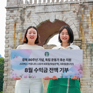 스타벅스, 독립유공자 후손 위해 8월 한 달 독립문역점·환구단점 수익금 전액 기부스타벅스 코리아(대표이사 손정현)가 광복 80주년을 맞이해 커뮤니티 스토어로 운영 중인 독립문역점과 환구단점의 8월 한 달간 수익금 전액을 독립유공자 후손의 경제적 지원을 위해 특별 기부한다. 또한, 독립유공자 후손 대상 장학금 전달식도 11년간 이어서 진행하며 뜻깊은 광복절을 맞이한다. 커뮤니티 스토어 6호점과 9호점으로 운영 중인 독립문역점과 환구단점은 매장에서 판매되는 모든