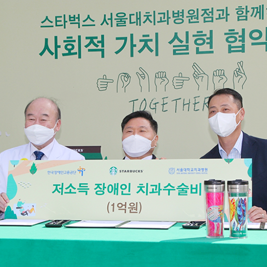 스타벅스, 한국장애인고용공단, 서울대치과병원과 함께 사회적 가치 실현 위한 MOU 협약 체결㈜스타벅스커피 코리아(대표이사 송호섭)가 장애인 고용 증진 및 장애인 인식개선 확산을 통한 사회적 가치 실현을 목표로 한국장애인고용공단(이사장 조향현) 및 서울대학교치과병원(병원장 구영)과 지속적인 상호협력을 약속하는 삼자간 MOU 협약식을 23일 서울대치과병원점에서 진행했다.