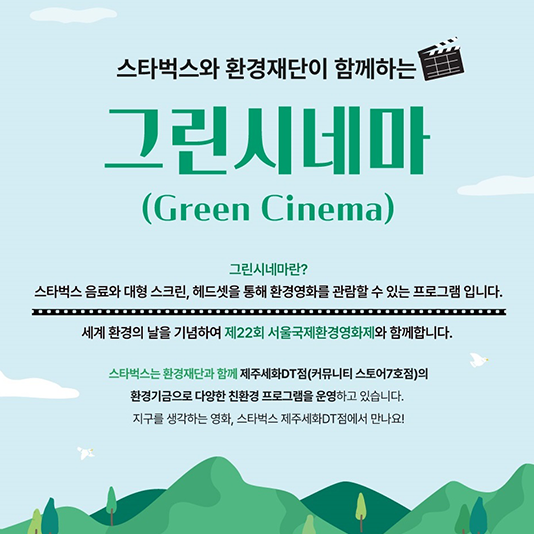“스타벅스 매장이 영화관으로 변신?” 스타벅스, 환경 영화제 사전 신청 이벤트 진행스타벅스 코리아(대표이사 손정현)가 6월 5일 세계 환경의 날에 맞춰 제주세화DT점에서 환경재단과 함께 개최하는 그린 시네마 행사 사전 참석 신청을 5월 12일부터 5월 29일까지 행사 홈페이지(greencampaign.kr)에서 진행한다.