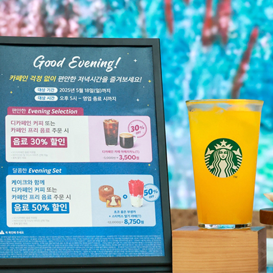 오후5시 이후라면 디카페인 커피 최대 반값! 스타벅스, 23일부터 ‘이브닝 이벤트’ 진행스타벅스 코리아(대표이사 손정현)가 4월 23일부터 5월 18일까지 약 한 달간 매일 오후 5시 이후 이벤트 대상 디카페인 커피 또는 카페인 프리 음료를 주문하는 고객에게 음료를 최대 50% 할인해주는 ‘이브닝 이벤트’를 진행한다.