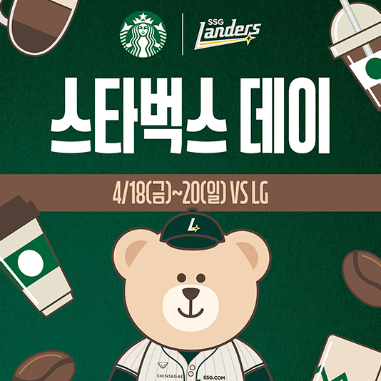 스타벅스, 인천SSG랜더스필드에서 4월 18일부터 ‘스타벅스 데이’ 연다스타벅스 코리아(대표이사 손정현)가 4월 18일부터 4월 20일까지 3일간 인천SSG랜더스필드에서 열리는 SSG랜더스 대 LG트윈스 3연전을 스타벅스 데이로 진행한다.