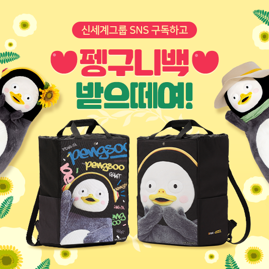 신세계그룹 SNS 구독하고 펭구니백 받자!신세계그룹 인스타그램과 유튜브 채널 팔로우하고 펭구니백 받자. 피코크X펭수 콜라보 상품 3종도 함께 드려요.