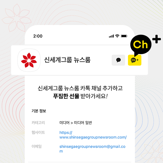 신세계그룹 뉴스룸 카톡 채널 추가 이벤트신세계그룹 뉴스룸 카톡 채널 추가 이벤트 OPEN! 이제 신세계그룹 뉴스룸 소식을 카카오톡으로 빠르게 만나보실 수 있습니다. 신세계그룹 뉴스룸 카톡 채널 추가하고 푸짐한 선물도 받아가세요!