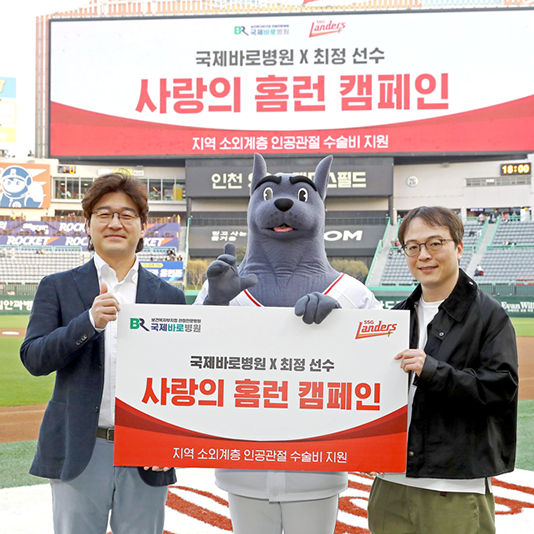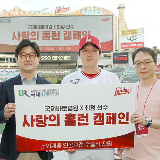 SSG랜더스의 최정 선수가 5월 29일(목) 인천SSG랜더스필드에서 열린 NC다이노스와의 홈경기에 앞서 국제바로병원과 함께 ‘사랑의 홈런 캠페인’ 협약을 체결했다.