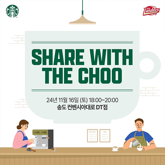 SSG 추신수, 스타벅스와 ‘SHARE WITH THE CHOO’ 진행SSG랜더스(대표이사 김재섭, 이하 SSG) 추신수 선수가 ‘SHARE WITH THE CHOO’ 프로그램을 통해 16일(토) 인천 송도에 위치한 스타벅스 송도컨벤시아대로 DT점에서 팬들과 소통하는 자리를 가진다.