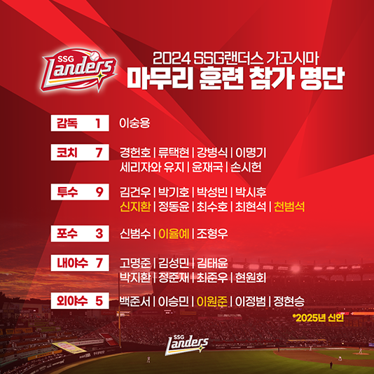 SSG랜더스, 가고시마 유망주 캠프 실시SSG랜더스(대표이사 민경삼, 이하 SSG)는 10월 29일(화)부터 11월 28일(수)까지 31일간 일본 가고시마현 사쓰마센다이시에 위치한 종합운동공원에서 유망주 캠프를 실시한다.