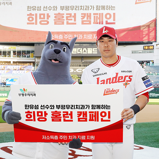 SSG랜더스 한유섬, 부평우리치과와 8년 연속 ‘희망 홈런 캠페인’ 진행SSG랜더스(대표이사 민경삼) 한유섬 선수가 부평우리치과(원장 김재인)와 함께 하는 ‘희망 홈런 캠페인’을 8년 연속으로 진행한다.