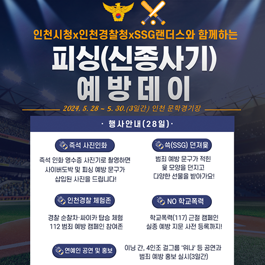 SSG랜더스, 인천시·인천경찰청과 ‘피싱예방 데이’ 실시SSG랜더스(대표이사 민경삼, 이하 SSG)는 28일(화)부터 30일(목)까지 인천SSG랜더스필드에서 열리는 LG트윈스와의 3연전을 맞아 인천시, 인천경찰청과 함께하는 ‘피싱예방 데이’를 진행한다.