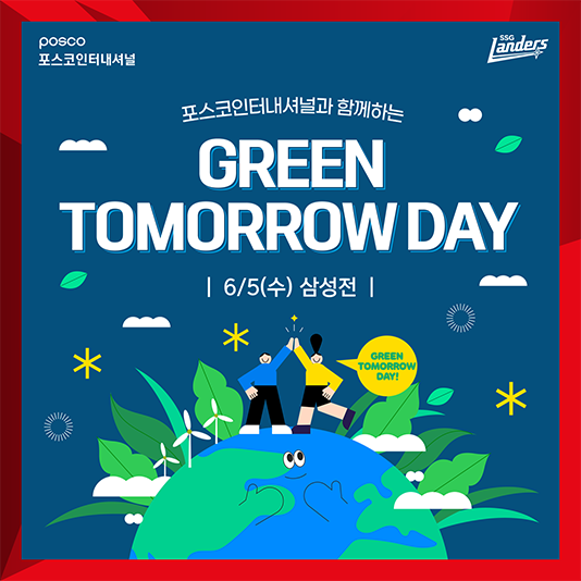 SSG랜더스, 포스코인터내셔널과 함께하는 ‘그린 투모로우 데이’ 진행SSG랜더스(대표이사 민경삼, 이하 SSG)는 6월 5일(수) 인천SSG랜더스필드에서 열리는 삼성 라이온즈와의 홈경기를 맞아 포스코인터내셔널(대표이사 이계인)과 함께하는 ‘그린 투모로우 데이’ 행사를 진행한다.