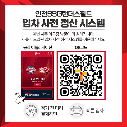인천SSG랜더스필드 ‘입차 사전 정산 시스템’ 도입SSG랜더스(대표이사 민경삼, 이하 SSG)가 23일(토) 개막전부터 인천SSG랜더스필드(이하 야구장)를 차량으로 방문하는 관람객을 위해 ‘입차 사전 정산 시스템’을 도입한다.