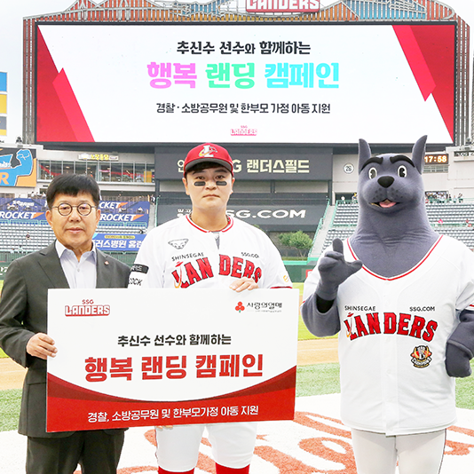 SSG랜더스 추신수, ‘행복 랜딩’ 캠페인으로 3년째 기부 프로그램 추진SSG랜더스(대표이사 민경삼, 이하 SSG)의 추신수 선수가 올시즌 순직 경찰·소방공무원 유가족과 저소득 한부모 가정 지원을 위한 ‘행복 랜딩’ 기부 캠페인을 진행한다.