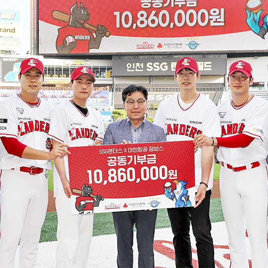 SSG랜더스, 대한항공 점보스와 인천 소외계층 아동 위해 공동 기부금 전달SSG랜더스(대표이사 민경삼, 이하 SSG)는 15일(목) KT와의 홈 경기를 맞아 ‘대한항공 점보스 데이’를 개최하고 인천 소외계층 아동 지원을 위한 기부금을 전달했다.