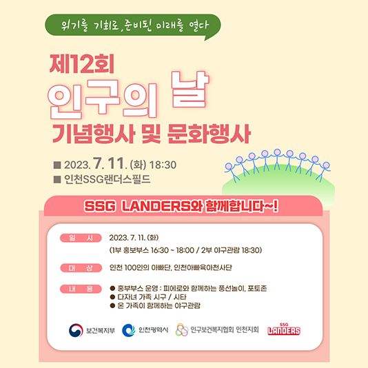 SSG랜더스, 인구보건복지협회 인천지회와 함께 ‘인구의 날’ 행사 진행SSG랜더스(대표이사 민경삼, 이하 SSG)는 11일(화) 인천SSG랜더스필드에서 열리는 두산베어스와의 홈경기를 맞아 인구보건복지협회 인천지회(이하 인구협회)와 함께 ‘인구의 날’ 행사를 진행한다.