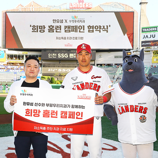 SSG랜더스(대표이사 민경삼, 이하 SSG) 한유섬 선수가 23일(화) LG트윈스와의 홈경기에 앞서 부평우리치과(원장 김재인)와 함께하는 ‘희망 홈런 캠페인’ 협약식을 진행했다.
