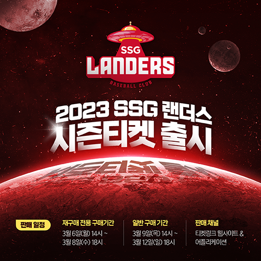 SSG랜더스(대표이사 민경삼, 이하 SSG)는 6일(월) 14시부터 12일(일) 18시까지 2023 시즌티켓을 판매한다.