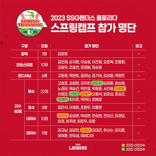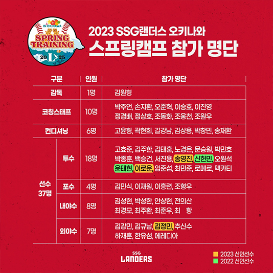 SSG랜더스, 2023년 스프링캠프 실시SSG랜더스(대표이사 민경삼, 이하 SSG)는 1월 30일(월)부터 3월 8일(수)까지 미국 플로리다(1차)와 일본 오키나와(2차)에서 스프링캠프를 실시한다.