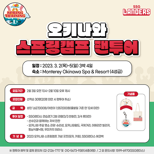 SSG랜더스, 일본 오키나와 스프링캠프 팬투어 실시SSG랜더스(대표이사 민경삼, 이하 SSG)가 2월 3일(금) 오전 10시부터 ‘2023 오키나와 스프링캠프 팬투어’ 참가자를 선착순(30명) 모집한다.