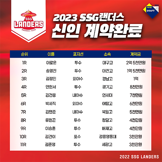 SSG랜더스, 2023 신인 선수 11명 전원과 계약 완료SSG랜더스(대표이사 민경삼, 이하 SSG)가 11일(화) 2023년 신인 선수 11명 전원과 계약을 완료했다.