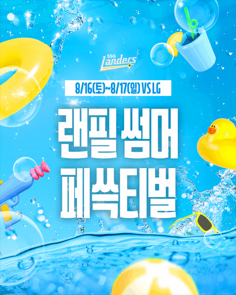 SSG랜더스, 무더위를 날릴 여름 축제 ‘랜필 썸머 페쓱티벌’ 개최SSG랜더스(대표이사 김재섭, 이하 SSG) 8월 16일(토)과 17일(일), 인천SSG랜더스필드에서 열리는 LG트윈스와의 홈경기에서 여름 시즌 테마 이벤트인 ‘랜필 썸머 페쓱티벌’을 개최한다. 이번 행사는 무더위 속 야구장을 찾는 팬들이 시원하고 특별한 경험을 즐길 수 있도록 기획됐으며 야구 관람과 물놀이, 공연이 어우러진 복합형 축제의