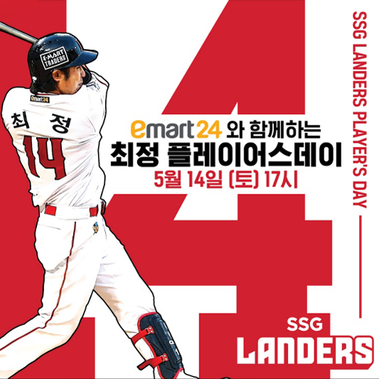 SSG랜더스, 14일 NC전서 이마트24와 함께 하는 ‘최정 플레이어스 데이’ 진행SSG랜더스(대표이사 민경삼, 이하 SSG)는 오는 14일(토) NC 다이노스와의 홈경기를 맞아 시즌 두 번째 ‘플레이어스 데이’ 이벤트를 진행한다.