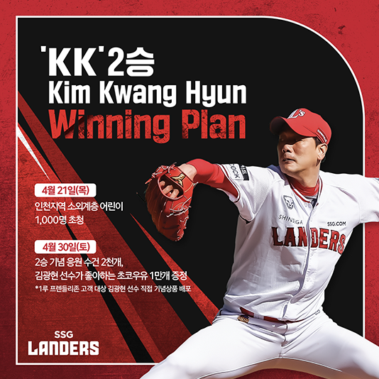 SSG랜더스, 김광현 시즌 2승 달성에 따른 ‘KK 위닝 플랜’ 2단계 실행SSG랜더스(대표이사 민경삼, 이하 SSG)가 김광현 선수와 함께 또 다시 특급 팬 서비스에 나선다. SSG는 지난 10일(일) 김광현 선수가 정규시즌에서 승리를 할 때마다 선수가 팬들에게 직접 팬 서비스를 제공하는 ‘KK 위닝 플랜’을 발표한 바 있다.