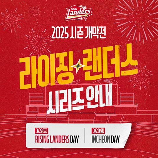 SSG랜더스, 홈 개막 2연전 ‘라이징 랜더스 x 인천 데이’ 이벤트 개최SSG랜더스(대표이사 김재섭, 이하 SSG)는 22일(토)과 23일(일) 양일간 인천SSG랜더스필드에서 펼쳐지는 두산베어스와의 홈 개막 2연전에 ‘라이징 랜더스 × 인천 데이’ 이벤트를 개최한다.