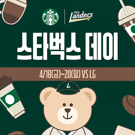 SSG랜더스, LG와의 주말 3연전에 ‘스타벅스 데이’ 실시SSG랜더스(대표이사 김재섭, 이하 SSG)가 18일(금)부터 20일(일)까지 인천SSG랜더스필드에서 열리는 LG트윈스와 주말 3연전을 맞아 스타벅스 코리아(대표이사 손정현, 이하 스타벅스)와 함께 ‘스타벅스 데이’를 실시한다.
