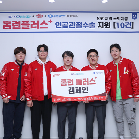 SSG랜더스, 플러스정형외과의원과 함께 저소득층 인공관절 수술 지원SSG랜더스(대표이사 김재섭, 이하 SSG)는 11일(수) 인천 연수구에 위치한 플러스정형외과의원(대표원장 정새롬, 이하 플러스정형외과)과 함께 ‘홈런플러스+ 캠페인’ 기부금 전달식을 진행했다.