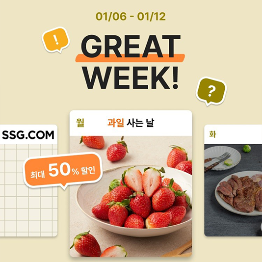 SSG닷컴, 새해에도 ‘장보기’ 힘준다… 신선, 가공식품 릴레이 특가SSG닷컴이 을사년 새해를 맞아 오는 12일까지 일주일간 장보기 상품 릴레이 특가 행사 ‘그레잇 위크(Great Week)’를 진행한다고 6일 밝혔다.