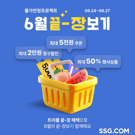 SSG닷컴, 물가 안정 프로젝트 ‘6월 끝-장보기’ 프로모션 개최SSG닷컴이 오는 27일까지 나흘간 ‘6월 끝-장보기’ 프로모션을 진행한다고 24일 밝혔다.
