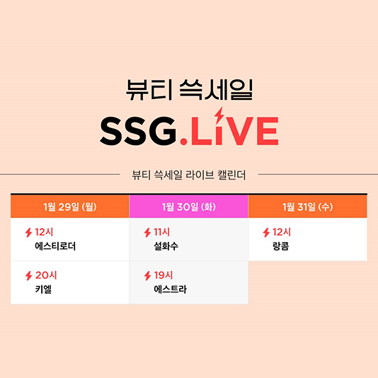 SSG닷컴, 설 명절 앞두고 ‘릴레이 뷰티 쓱라이브’ 특별 편성SSG닷컴이 1월 29일부터 내달 4일까지 1주일 간 ‘뷰티 쓱세일’을 열고 선물용으로 알맞은 국내외 인기 화장품 브랜드 대표 상품을 특가에 판매한다고 28일 밝혔다.